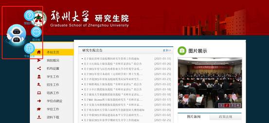 点击访问郑州大学研究生院网站(http://gs.zzu.edu.cn/),如下图所示访问学校官方网站,点击招生问答功能。
